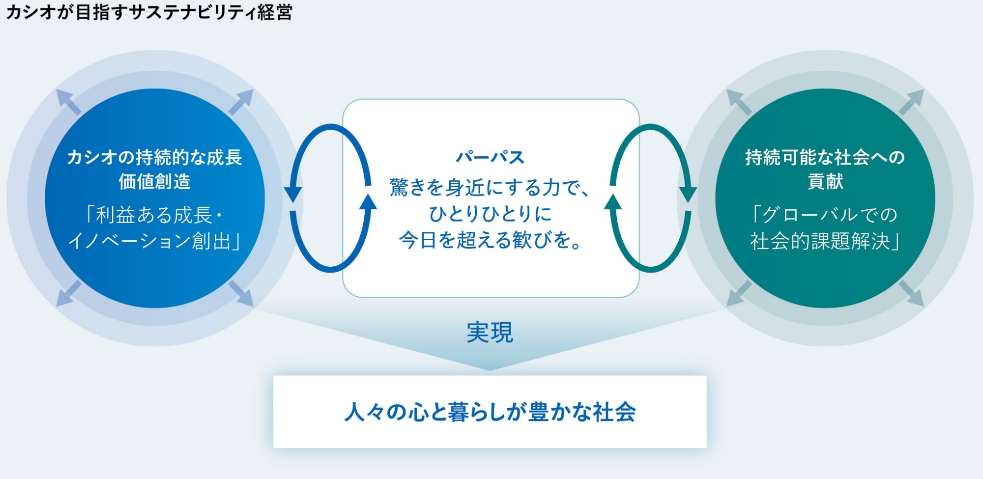 カシオのサステナビリティ経営とは、従業員一人ひとりがこれらを実践し、力を集結させて新たな価値を創造し、社会に提供していくことで、企業自身の持続的な成長と持続可能な地球・社会づくりへの貢献を両輪で実現することです。