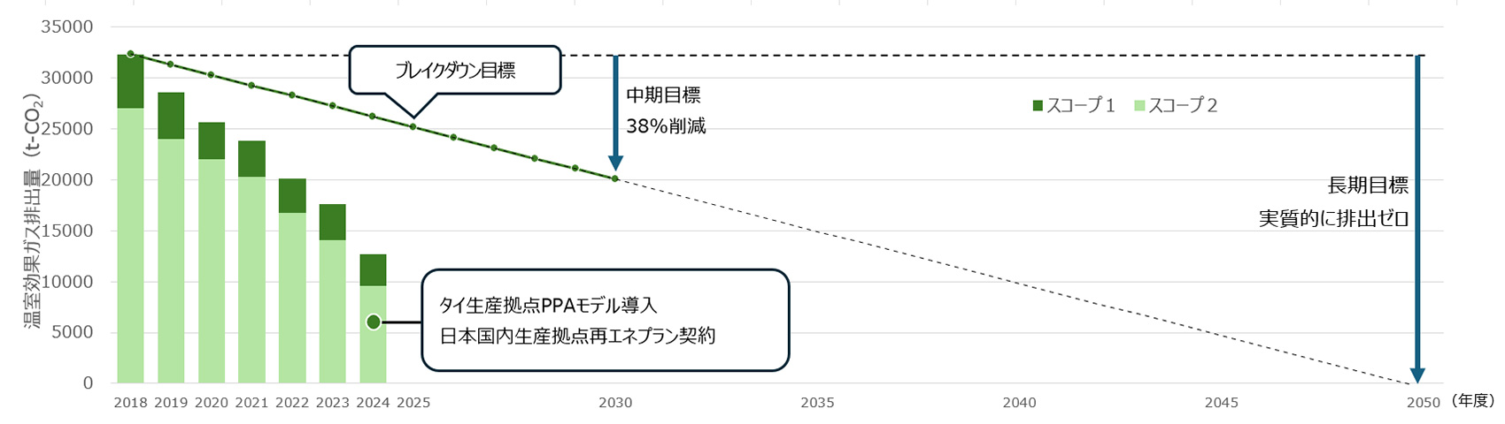 2024年度は、これまでに実施した再エネプラン契約や、PPAモデル導入をさらに拡大し、タイ生産拠点におけるPPAモデル導入、日本国内生産拠点の再エネプラン契約を行いました。 これにより2024年度時点で、中期目標値(2018年度基準で38%削減)を達成いたしました。