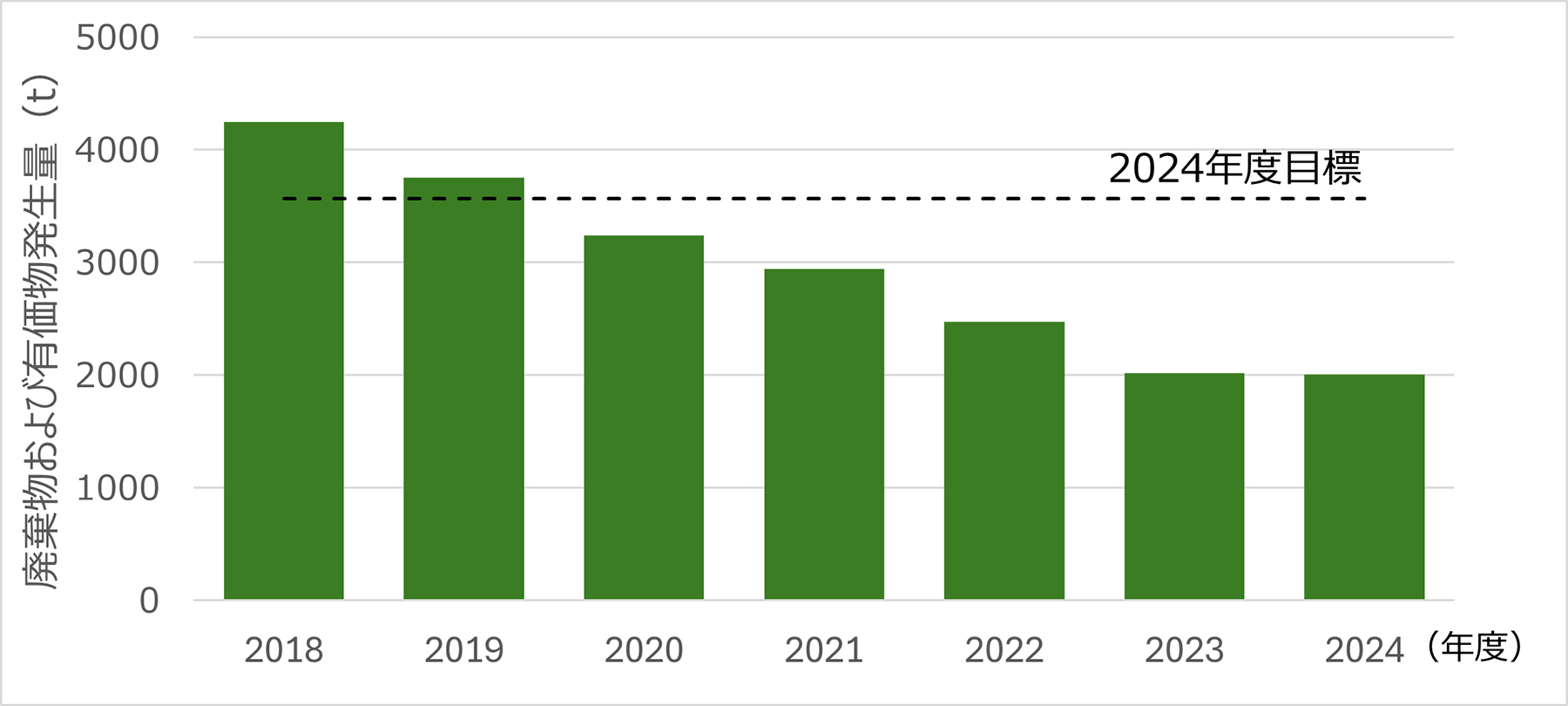 年度ごとに目標を設定し、達成状況を確認しています。2024年度は、廃棄物および有価物合計量を2019年度比5%以上削減するとした目標を設定しました。