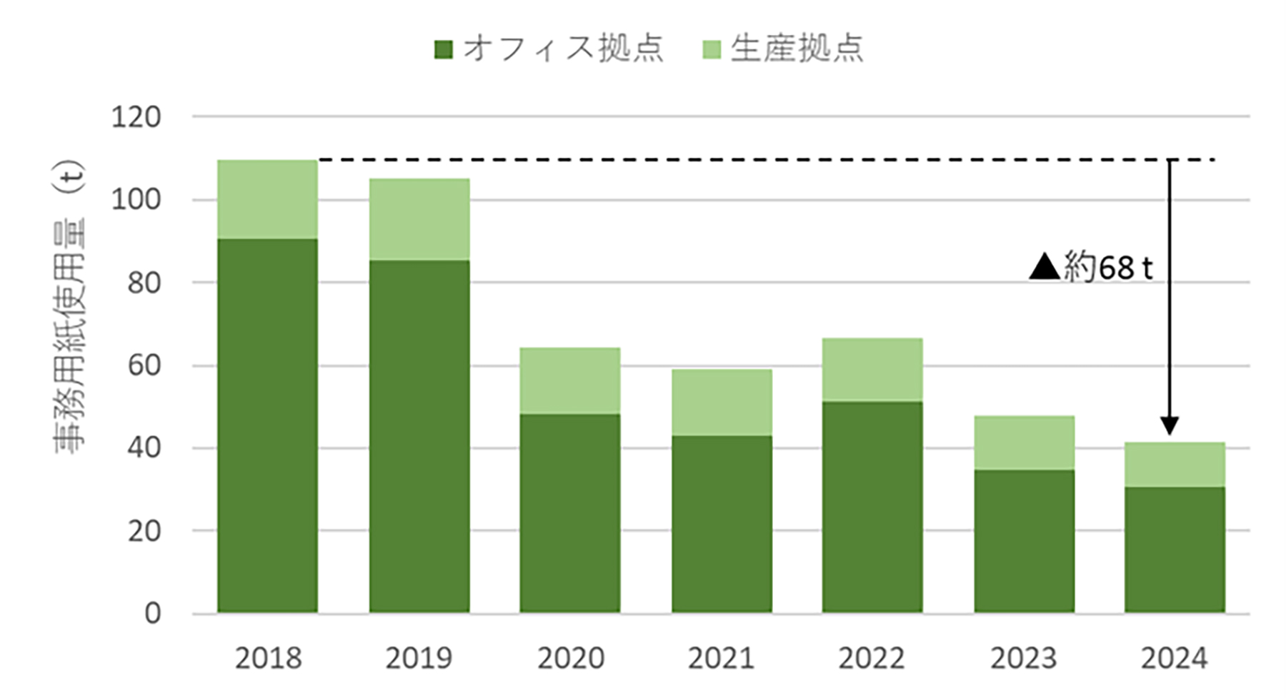 グループ各拠点でのコピー・事務用紙使用量は、オフィス拠点を中心に減少の傾向が続いており、2018年度基準で約68 tの減少となりました。