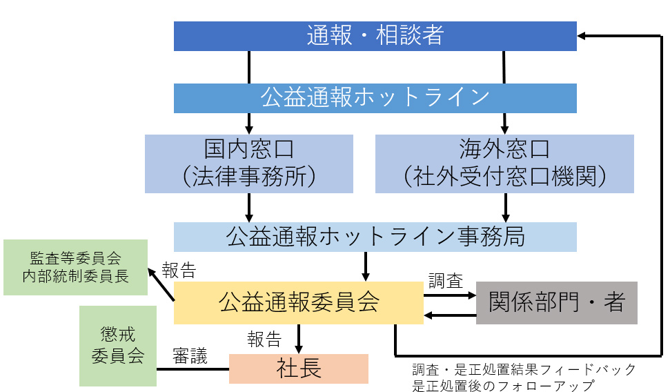 近年では、2020年6月の公益通報者保護法改正による公益通報制度の実効性向上の要請に伴い、以下の体制図の通り社内での独立性を確保した「公益通報委員会」を常設することとし、社内規程を改定して通報者に対する不利益取扱い又は報復行為の禁止、守秘義務などを明確にし、さらに2025年5月の同法改正に伴う制度見直しを行うなど通報者が利用しやすい制度となるよう、改善に取り組んでいます。また、ガバナンス担当役員と人事担当役員も委員会メンバーとして参加することで、中立の立場で公正な取り扱いと信頼性確保につながる体制を設けています。