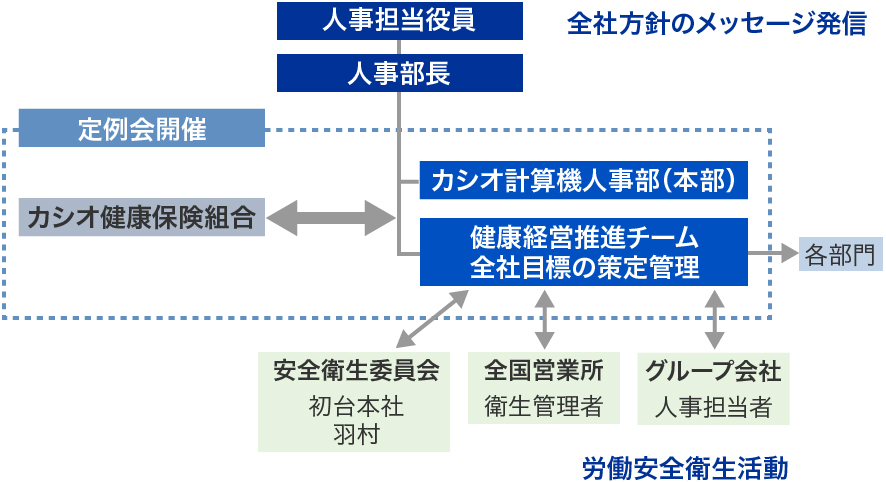 人事部健康経営推進チームは、カシオ健康保険組合との充分な連携のもと、各種の健康増進施策を推進しています。また、安全衛生委員会においては、従業員からの健康経営に関する意見の吸い上げなどの取り組みを行っています。