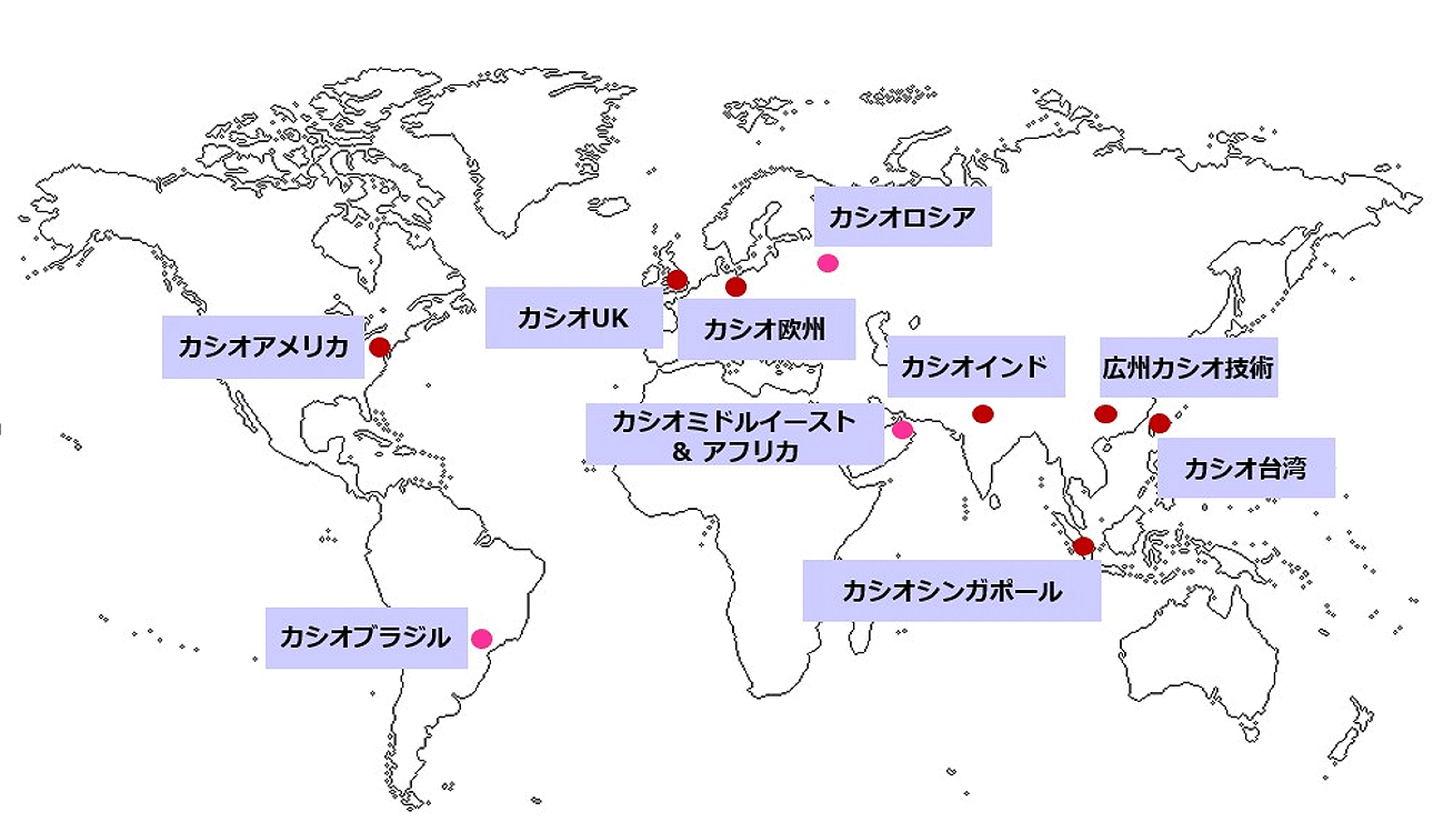海外におけるカシオ製品のアフターサービスは、海外グループ会社10社および協力会社約1,000社で行っています。(2025年3月時点)