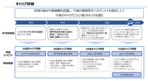 主に50代の社員が、人生設計を考え、自律的な生き方・働き方を描くために、転進支援サービスを導入し、キャリア実現の支援を行っています。