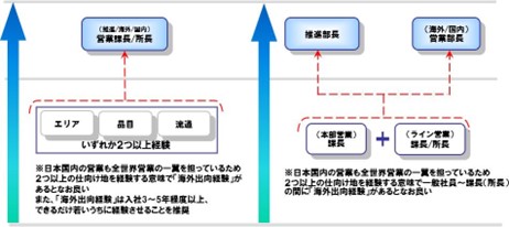 持続的にグローバル人材を育成するためには、人事から社員に対する直接的なアプローチだけでなく、現場で仕事を通じて成長できるように、グローバル人材を育成できる人材をマネジャーとして育成・登用する必要があります。そこで、従来のキャリアパスをグローバルキャリアパスに発展させました。海外営業以外を担当している社員が、少しでも視野を広く持てるように、係長、課長、部長になるまでに幅広い経験を得られるように配置強化しており、今後の育成・配置計画に活かしていきます。