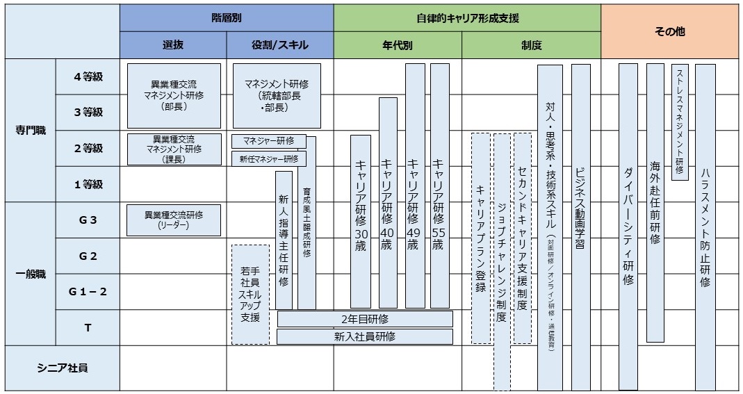 階層ごとの研修や、幹部候補育成のための選抜研修、年代別のキャリア研修等、各階層および各年代の社員に対して必要な育成施策を実施し、常に改善・拡充に努めています。