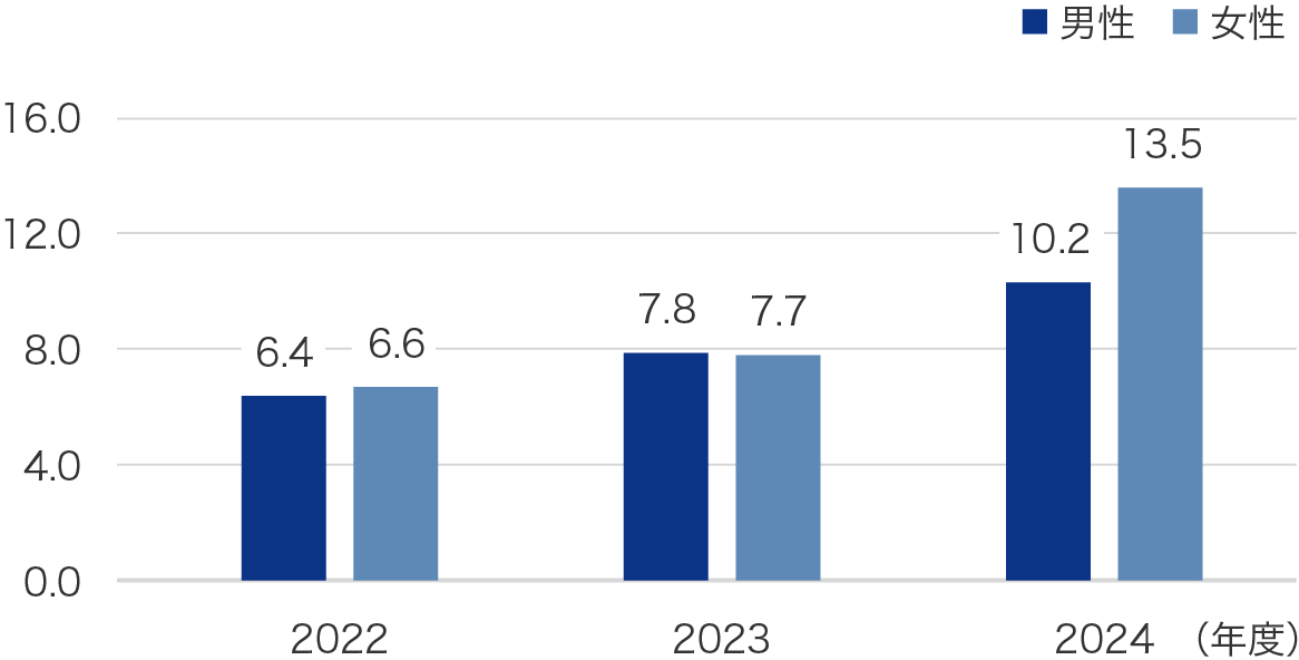 2024年度の年間平均研修時間は、男性10.2時間、女性13.5時間となっています(2023年度は男性7.8時間、女性7.7時間)。2024年度は、DX人材育成施策の実施に加え、幹部候補育成研修を充実させる取り組みを行いました。2025年度は引き続き経営方針に沿った人材育成に向けて研修の充実を図り、研修時間を確保していきます。