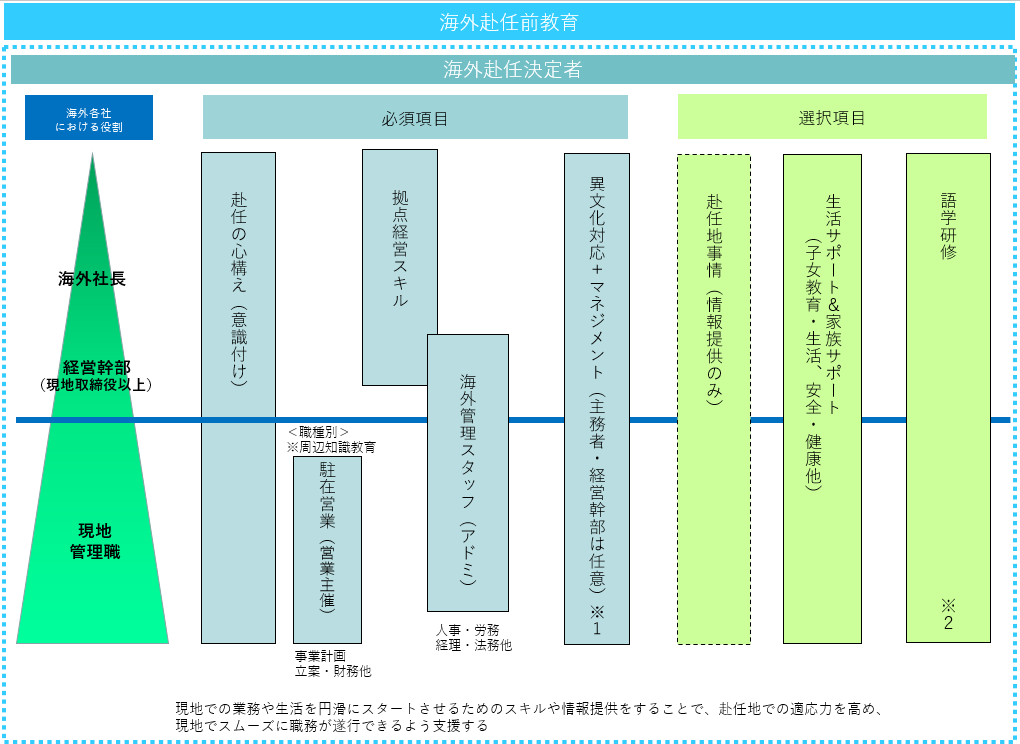 経営幹部に対する「拠点経営スキル研修」、全赴任者に対する「異文化対応マネジメント研修」「赴任地事情の提供」を行うほか、拠点での生活サポート強化を目的とし、安全対策や帯同子女のための教育情報を提供しています。