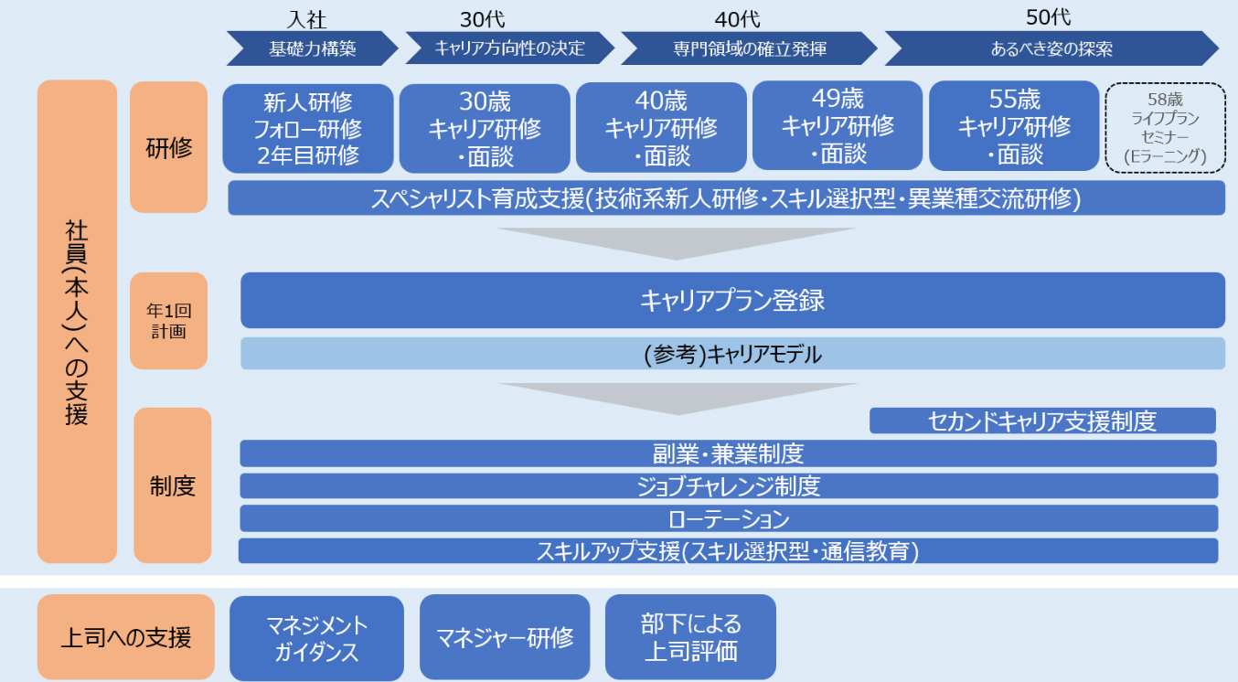 「社員の持続的成長(育成)こそが、企業の持続的価値向上につながる」という考え方から、社員それぞれが自律的に必要なスキルを得られるような体制を整備し、社員個人の成長を支援していきます。 特に、各年代のキャリアの節目でキャリア研修や面談の実施、スペシャリストとしてのキャリアを支援する研修の充実、上司の業務支援やキャリア支援向上のための研修を充実するなど、社員のキャリア形成支援の取り組みを行っています。