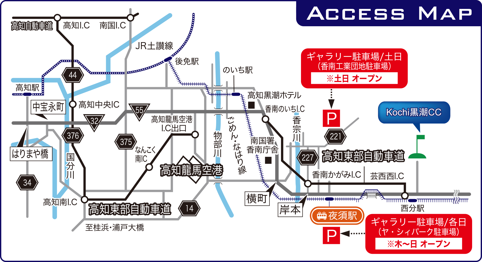 高知市内方面より▶高知東部自動車道 高知龍馬空港I.C ▶ 国道55号 ▶ 案内看板に従ってヤ・シィパーク地駐車場へ