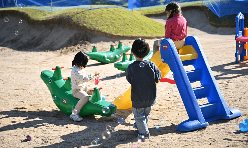 お子様向けの遊具やバンカーでの砂遊び、ロゴスのキャンプ体験グッズなどもご用意しています。