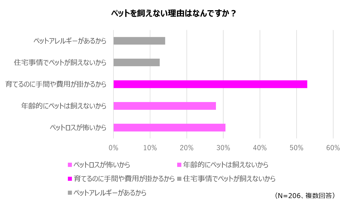 「ロス」を和らげる存在としてペットを選択肢に入れないと回答した人は51.5%にのぼりました。その主な理由として、「育てる手間や費用がかかる」(53%)や「ペットロスが怖い」(31%)といった点が大きな課題であることが明らかになりました。