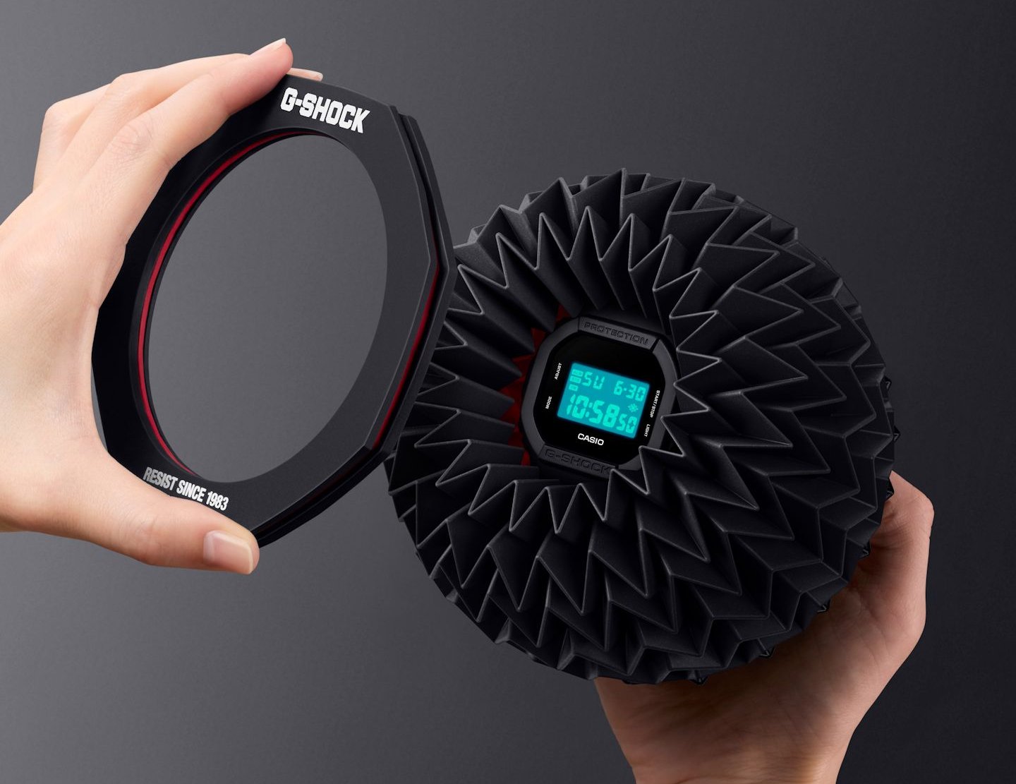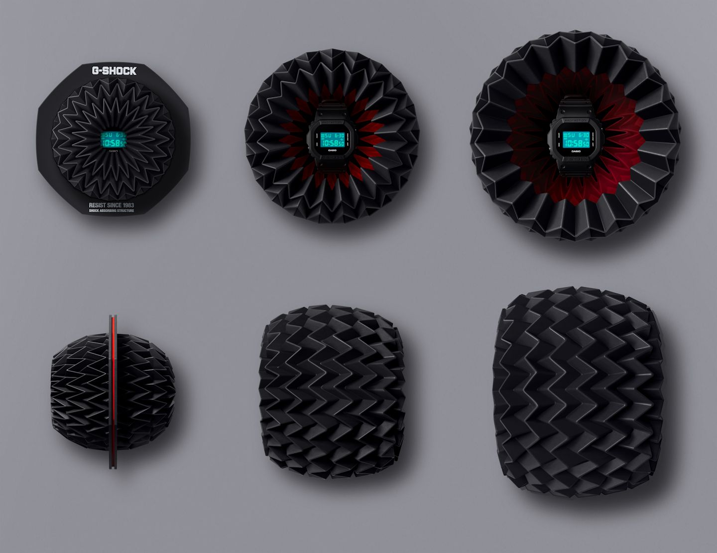 “G-SHOCK”が追求してきた「タフネス」の新たな解釈として、ミウラ折り※2を採用したパッケージ構造により、衝撃に対してしなやかに対応する耐性=レジリエンスを表現しています。収縮自在なミウラ折りの紙の中に商品を入れて“G-SHOCK”のアイコンである八角形のリングで閉じるスタイリッシュなデザインに仕上げました。