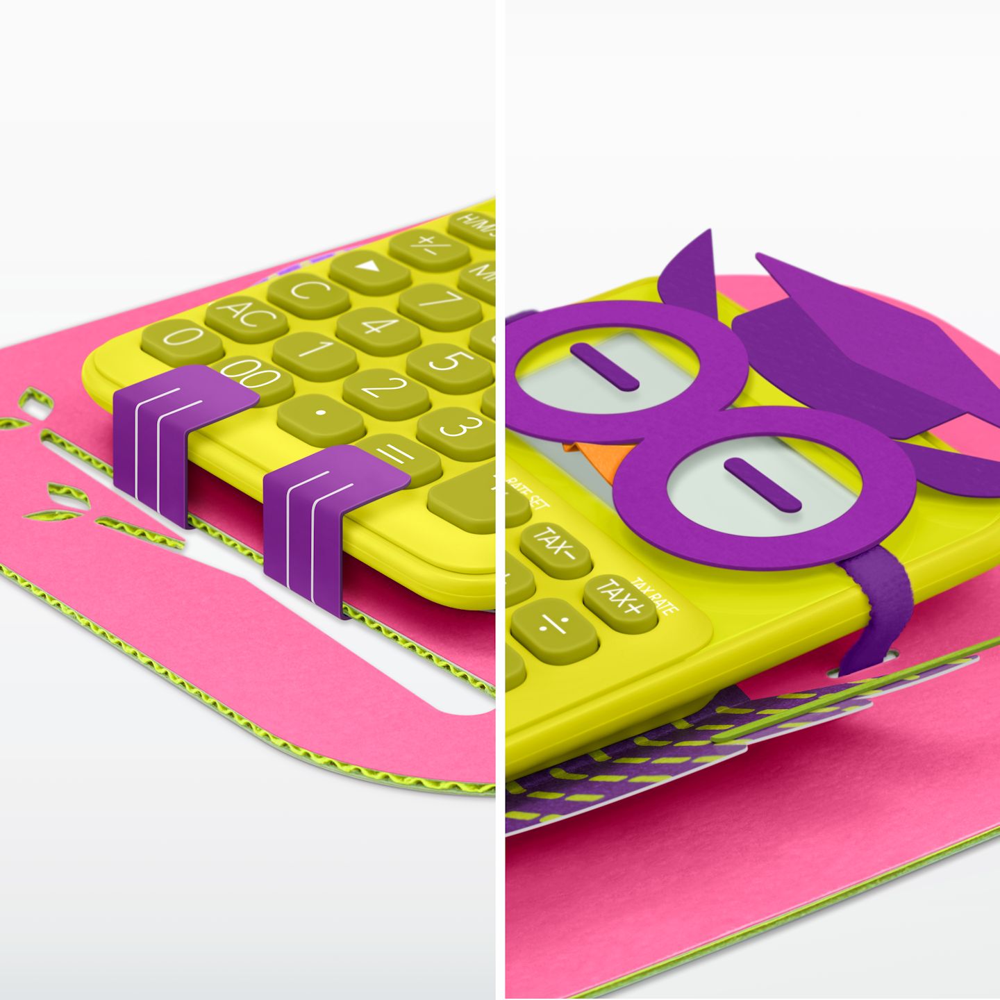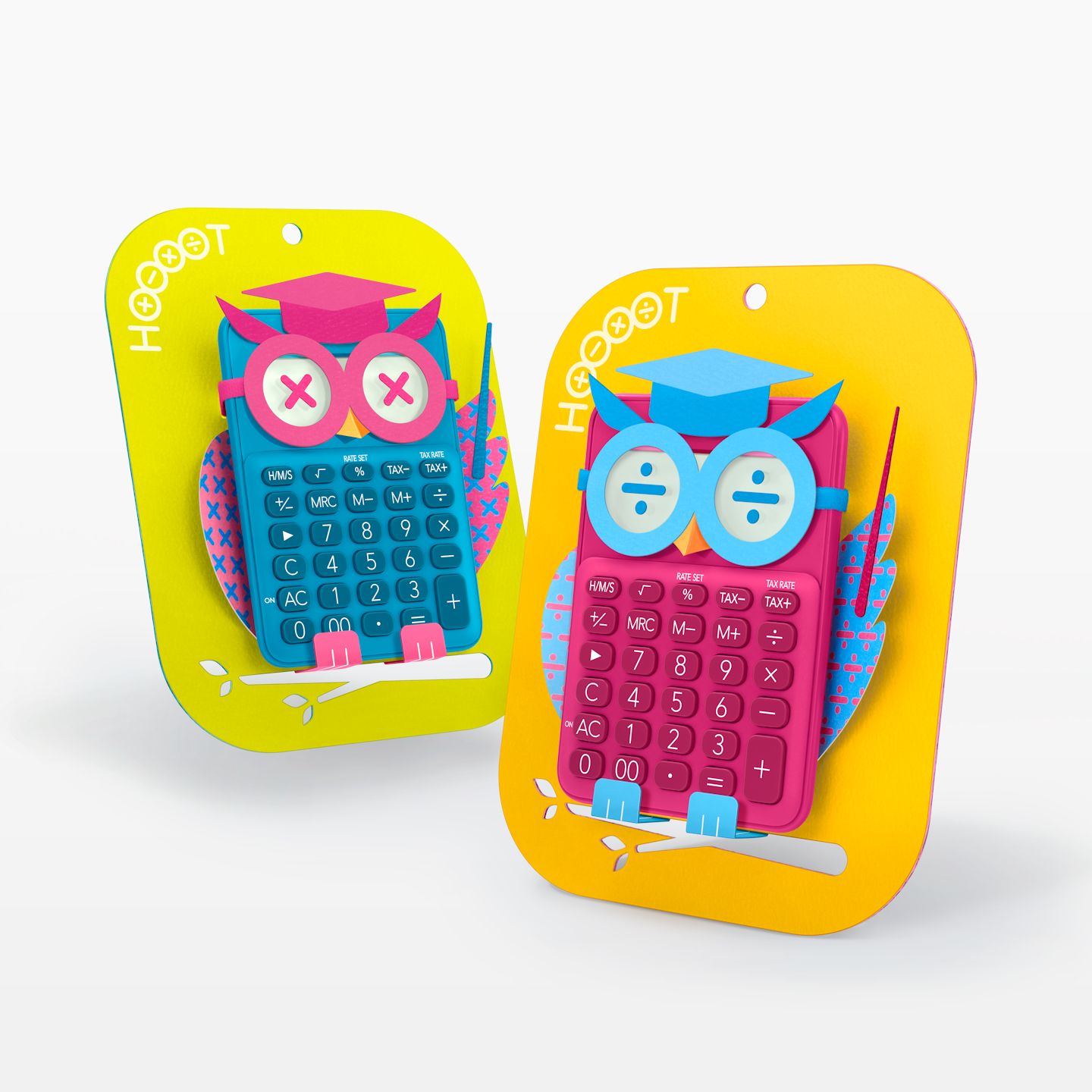 子供たちが電卓で計算してみたいと感じられるように、知性の象徴であるフクロウをモチーフにした可愛らしい電卓パッケージです。フクロウの瞳や羽の模様には電卓ならではの「+」「-」「×」「÷」の記号を取り入れ、ユニークでカラフルなデザインに仕上げました。