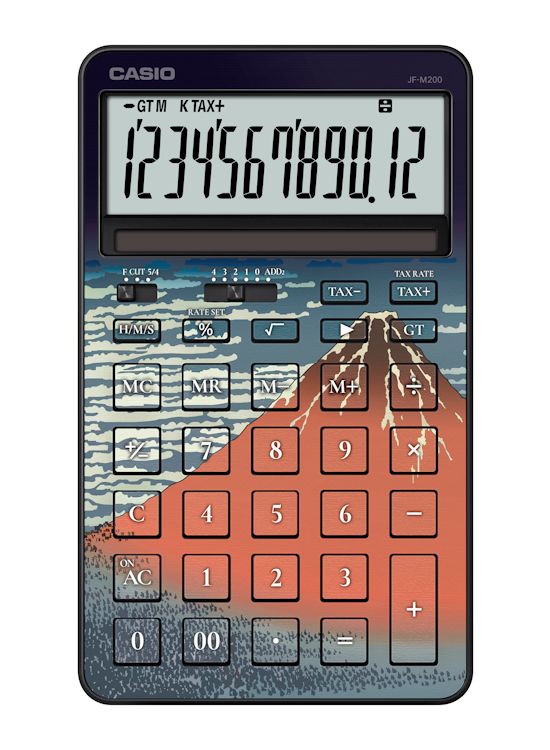 今回ご案内します『JF-M200-TJ-KHK/JF-M200-TJ-KHG』は、世界的にも高い評価を受ける葛飾北斎の「富嶽三十六景」から選りすぐった名作をデザインモチーフにした電卓です。スタイリッシュ電卓のフラットな形状を活かし、キートップを含む全面にインクジェットプリントを施すことで、浮世絵の魅力を余すことなく表現しました。また、浮世絵の和風な雰囲気に合わせ、キーフォントを和の意匠に調和する明朝体に変更し、モダンな機能性と日本の美的感覚を見事に融合させています。