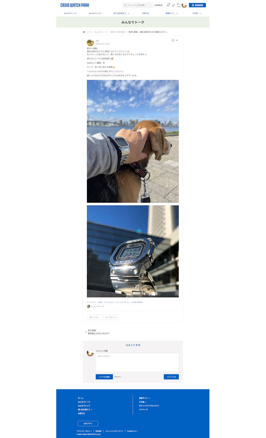 本サービスはどなたでも無料で閲覧でき、投稿機能を使用する場合は、CASIOIDのログインが必要です。投稿形式は「写真投稿」と「トーク投稿」の2種類を用意しました。「写真投稿」は時計の写真を中心に投稿する形式で、お気に入りの1本や自分の大切なコレクション、旅行先でのベストショットなど、「時計と過ごすシーン」を写真とともに共有できます。「トーク投稿」は写真添付を必須とせず、「カシオの腕時計との初めての出会い」や「時計にまつわるエピソード」など、幅広いテーマで気軽に投稿する形式です。また、他のユーザーの投稿へのコメント機能といったユーザー同士のつながりを促進する仕組みも備えています。