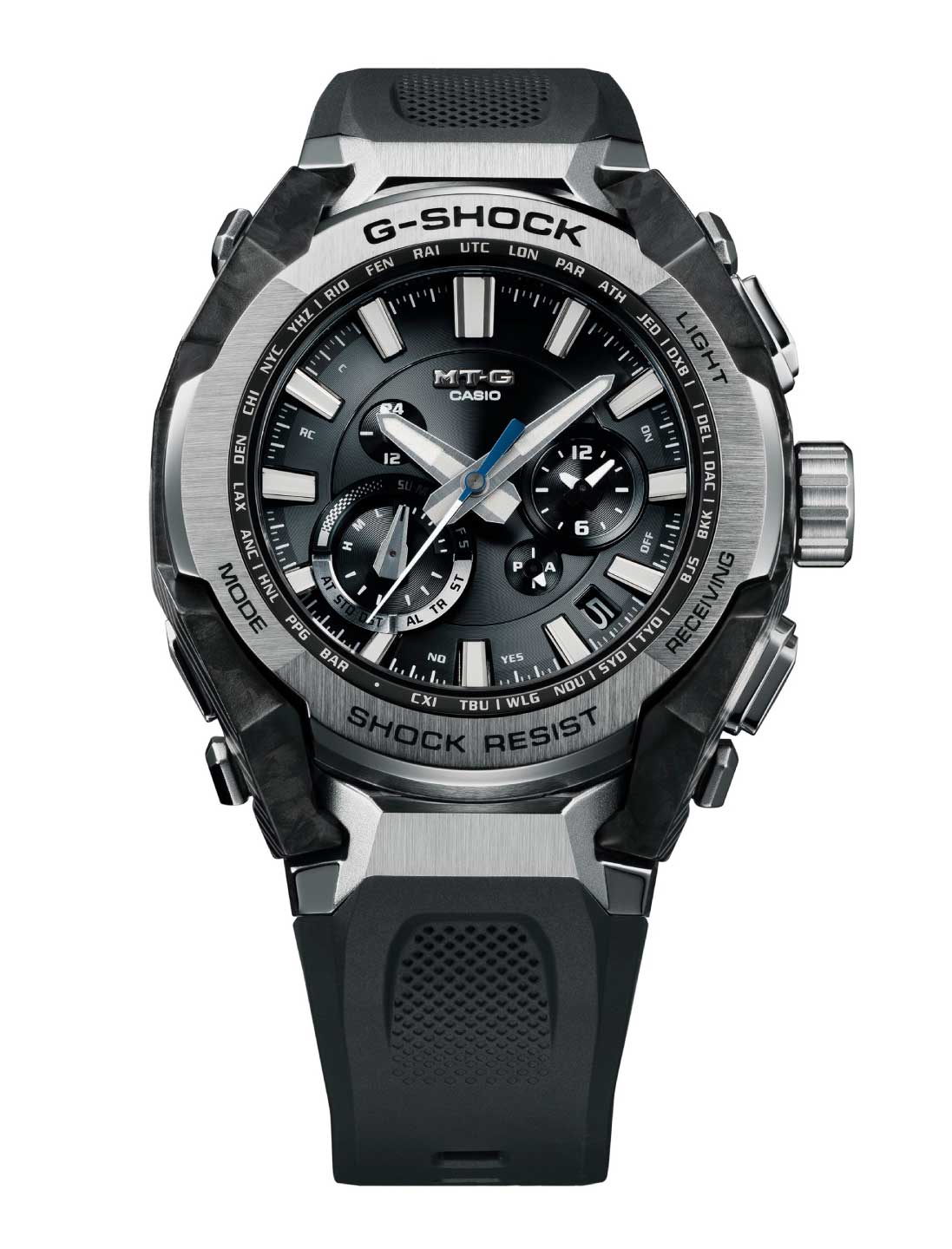 耐衝撃ウオッチ“G-SHOCK”のメタルと樹脂を融合させた“MT-G”シリーズより、人とAIの共創により開発された耐衝撃ウオッチです。生成AIによる荷重シミュレーションを活用し、カーボンとグラスファイバーを積層した母材から削り出した独創的なフレームが特徴です。側面から見える美しいレイヤー模様と、ザラツ研磨を含む繊細な加工により上質感と立体感を実現した、人間とAIの協働による革新的なデザインです。