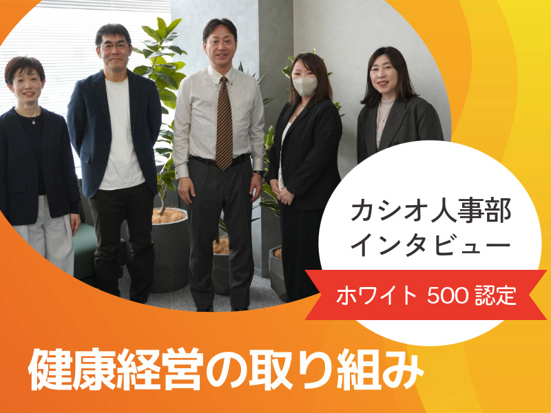 「皆さんに健康で元気に働いてほしい」という思いを一つにして、カシオでは社内の複数の部門や健康保険組合、労働組合が連携して、社員が健康で元気に働けるよう支援に取り組んでいます。主管部門のトップである小林執行役員と人事部の皆さんにお話をうかがいました。